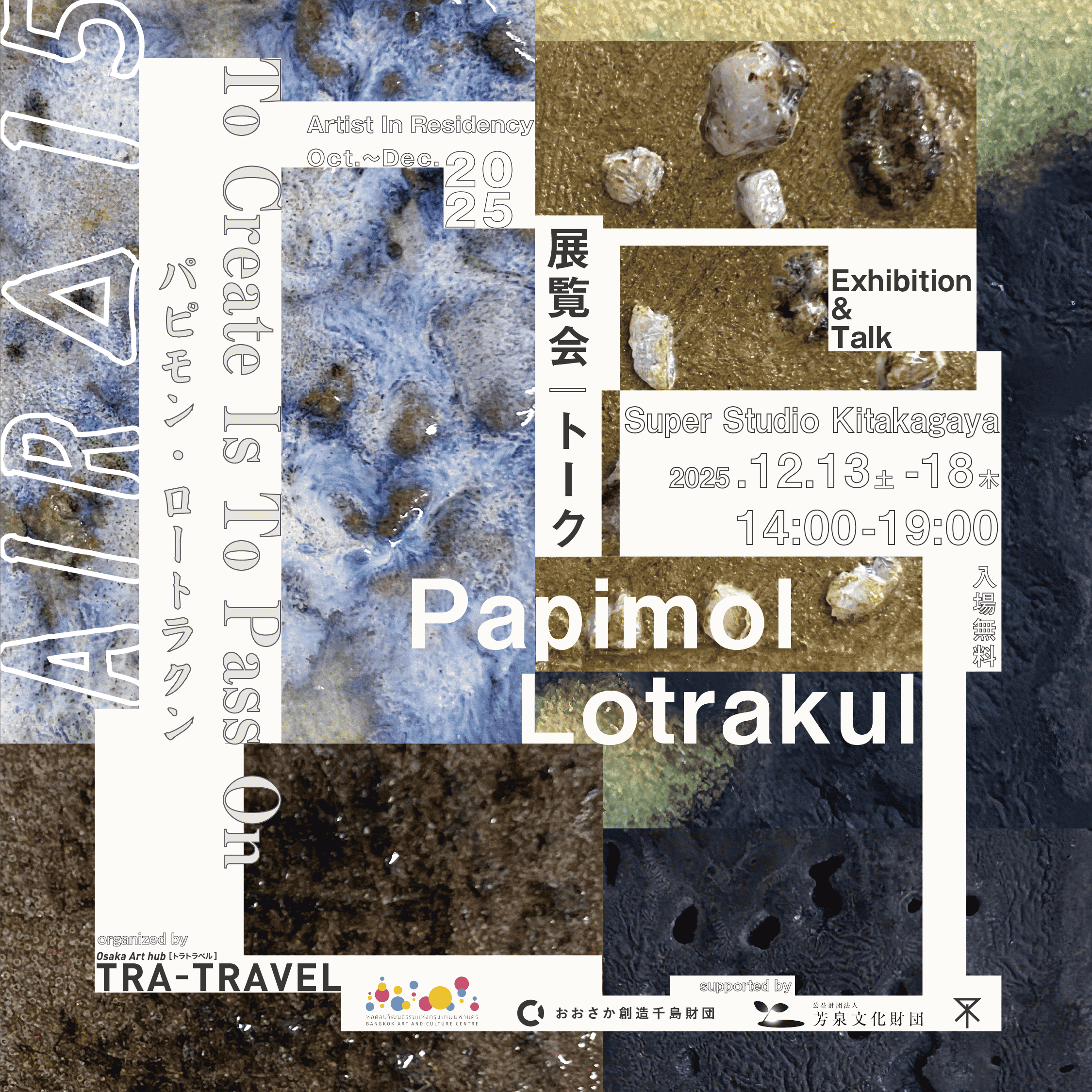 * Invited through the artist-in-residence program AIR Δ vol.15, organized by TRA-TRAVEL in collaboration with BACC / Bangkok Art and Culture Centre (Bangkok).