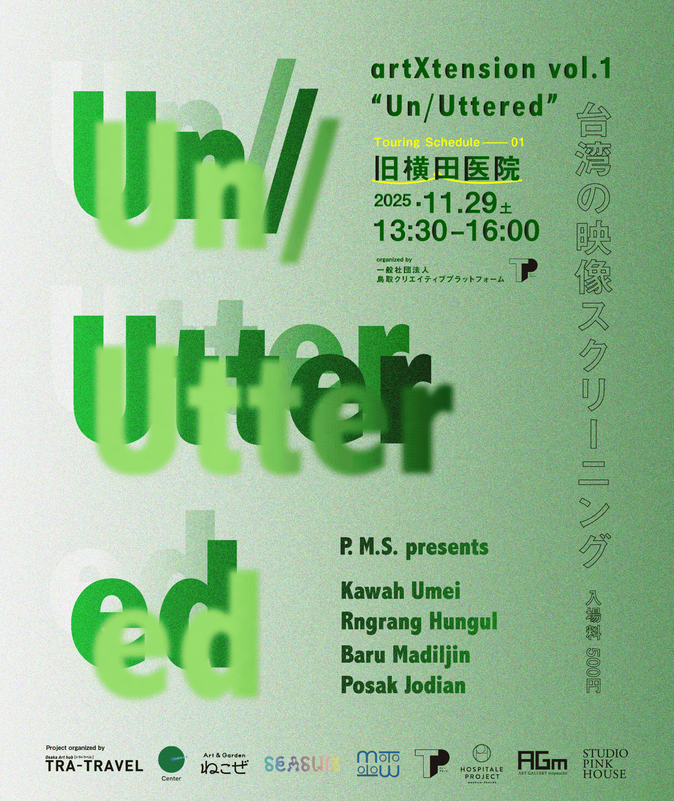 第一弾は、2024年にTRA-TRAVEL(大阪)が、台湾のコレクティブOCAC内のチームP.M.Sと共に企画した、台湾の映像スクリーニング『Un/Uttered』を国内8箇所のアートスペースに巡回します。