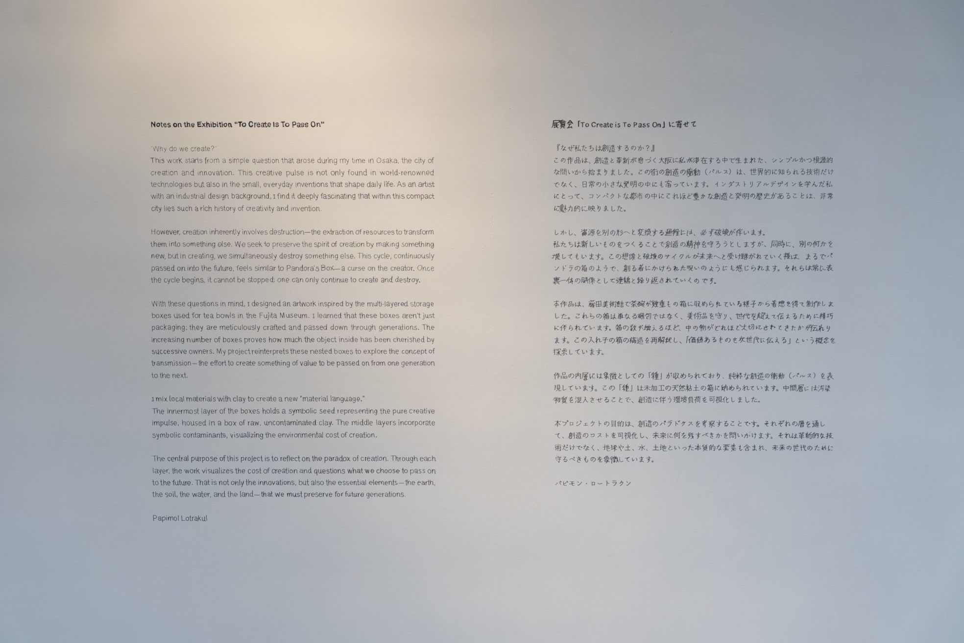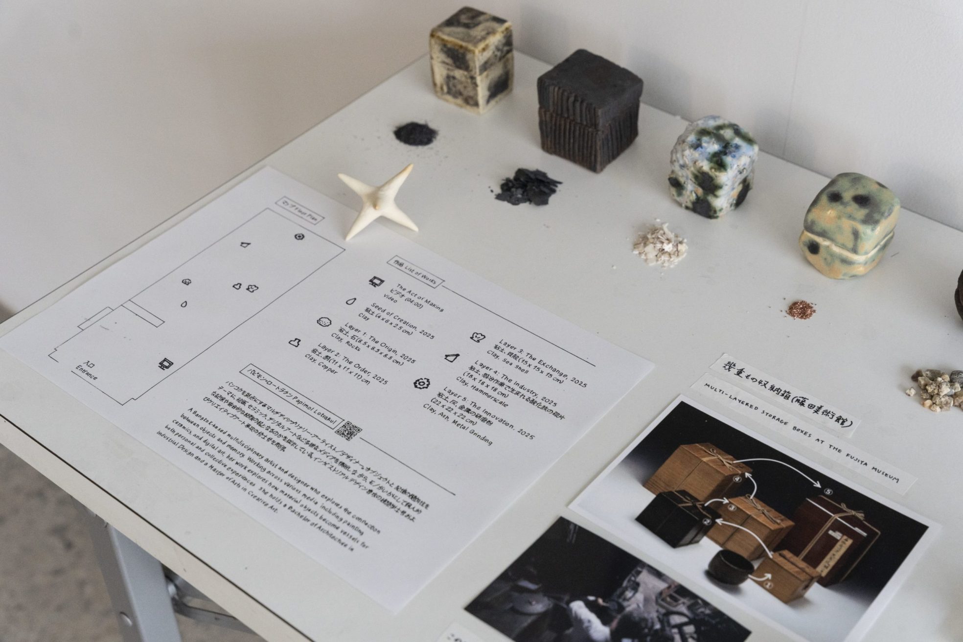 JP/EN 26 December 2025 exhibition ”To Create Is To Pass On” at Super Studio Kitakagaya, Osaka. talk event ”What People Create and Archaeological Imagination”. Photo: Yukawa-Nakayasu. English follows Japanese. バンコクを拠点に活動するアーティスト、パピモン・ロートラクンによる展覧会『To Create Is To Pass On』は、アーティスト・イン・レジデンス AIRΔ vol.15 における、3カ月にわたる大阪での滞在制作の成果展です。 ロートラクンは、大阪に内在する〈モノづくり〉における“クリエイティビティ”、“職人技”、“イノベーション”に着目し、大阪での滞在制作を進めました。 大阪滞在中、ロートラクンは〈つくる〉という行為そのものがたどる循環について考えるようになりました。新しくなにかを生み出す行為とは、必ず素材やエネルギーを要し、ときに何かを失うこともあります。創造と破壊は常に隣り合わせで、いったん始まった創造のプロセスは止まることなく続いていきます。 本展で発表される作品は、藤田美術館に所蔵される、幾重にも重なる茶碗箱から着想を得ています。ロートラクンはその形式を再解釈し、大阪で採取した素材を混ぜた粘土を用いて、多層構造の箱を制作しました。各層には、素材の原点から環境への影響まで、創造のプロセスにおける段階が表されています。 時代ごとに受け継がれてきた〈モノづくり〉の清濁をロートラクンは静かに掬い上げます。ぜひ展覧会をご高覧ください。 ・・・・・・・・・・・・・・・・・・・・・・・・・・・・・・・・ ✅展覧会概要 パピモン・ロートラクン『To Create Is To Pass On』 会期:2025年 12月13日〜18日 会場:Super Studio Kitakagaya 1階 ギャラリー 〒559-0011 大阪府大阪市住之江区北加賀屋5丁目4−64 入場:無料 ✅トークイベント概要 「人が創るものと考古学的な想像力」 (ゲスト:安芸早穂子) 日時:12月14日 18:00 – 19:30 会場:Super Studio Kitakagaya 1階 ギャラリー 〒559-0011 大阪府大阪市住之江区北加賀屋5丁目4−64 入場:無料 通訳者:和田太洋 ・・・・・・・ 主催:TRA-TRAVEL 協力:BACC、おおさか創造千島財団 助成:大阪市、芳泉文化財団 キュレーター:柏本奈津 ✅アーティスト パピモン・ロートラクン|Papimol Lotrakul バンコクを拠点に活動するマルチディシプリナリー・アーティスト/デザイナー。プロダクトデザインの背景を生かし、物質に宿る物語を手がかりに、形と意味の結びつきを探求している。人間性や文化的記憶、人と物のあいだに存在する見えないつながりへの関心を原動力とし、記憶がどのように素材へと結びつき、物が個人および共同体の経験を受け止める器となるのかを追究している。 ※TRA-TRAVELと BACC / Bangkok Art and Culture Centre(バンコク)によるアーティスト・イン・レジデンスプログラム「AIR Δ vol.15」にて招致 ーーーーーーーーーーーーーーーーーーーーーーーーー AIRΔ vol.15 |Papimol Lotrakul The solo exhibition To Create Is To Pass On by Bangkok-based artist Papimol Lotrakul presents the results of her three-month residency, AIRΔ vol.15, in Osaka. Developed during her stay in a city shaped by creativity, craftsmanship, and innovation, the exhibition explores the cycle of making. During her time in Osaka, Papimol began to question the process of creation itself. She observed that every new act of making requires materials, energy, and sometimes loss. Creation and destruction coexist, and once the creative process begins, it moves forward without stopping. The work is inspired by the layered tea bowl boxes in the collection of the Fujita Museum. In this exhibition, Papimol reimagines this format as a series of ceramic boxes made from clay mixed with materials gathered locally in Osaka. Each layer reflects a stage of creation—from its raw origins to its environmental impact—and the outermost structure invites visitors to write messages and hopes for the next generation. ・・・・・・・・・・・・・・・・・・・・・・・・・・・・・・・・ Papimol Lotrakul “To Create Is To Pass On” Venue: Super Studio Kitakagaya, 1F Gallery Admission: Free ✅ Talk Event “What People Create and Archaeological Imagination” Date & Time: December 14, 18:00–19:30 ・・・・・・・ Organized by: TRA-TRAVEL Supported by: Osaka City, Hosen Cultural Foundation Curator: Natsu Kashiwamoto ✅About the artist Papimol Lotrakul Papimol Lotrakul is a multidisciplinary artist and designer based in Bangkok. Her work explores the narratives embedded in physical objects, merging form with meaning. Driven by an interest in humanity, cultural memory, and the invisible connections between people and things, she reflects on how memory inhabits material and how objects become vessels for personal and collective experience. * Invited through the artist-in-residence program AIR Δ vol.15, organized by TRA-TRAVEL in collaboration with BACC / Bangkok Art and Culture Centre (Bangkok). AIR Δ / Artist-in-residency Program vol.15 パピモン・ロートラクン | Papimol Lotrakul Open Studio key image of AIRΔ vol.15 JP/EN 11 Nobember 2025 open studio at Super Studio Kitakagaya, Osaka. Photo by Yukawa-Nakayasu. AIRΔ vol.15は、TRA-TRAVEL、BACC(Bangkok Art and Culture Centre/バンコク)とが共催するアーティスト・イン・レジデンスです。 ーーーーーーーーーーーーーーーーーーーーーーーーーーーー Super Studio Kitakagayaにレジデンス滞在中のパピモン・ロートラクンが、